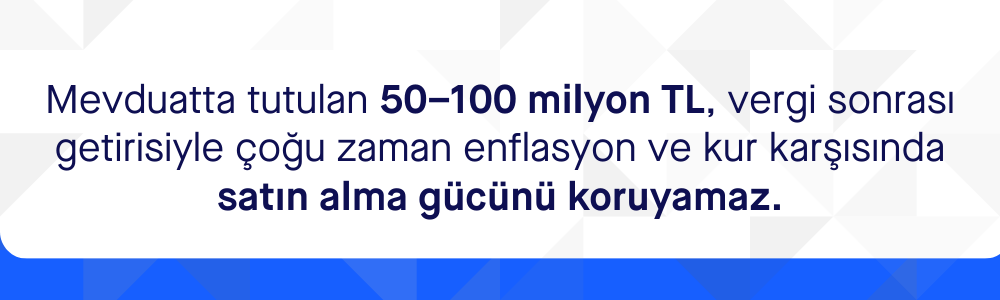 Ancak mevduat, getirisi bankanın sunduğu oranla sınırlı, enflasyon ve vergi etkisine açık, pasif bir değerlendirme aracıdır. Şirket nakdi bankada durur; değer üretimi şirket ekosisteminin dışında gerçekleşir.
